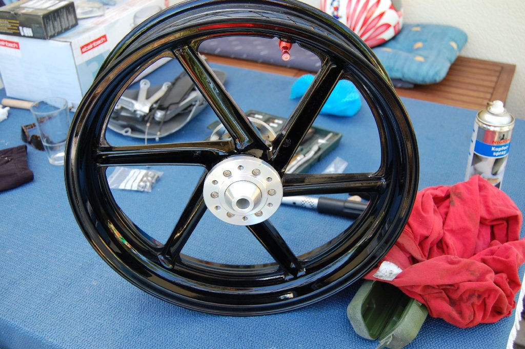 15 mm starke Adapter auf jeder Seite stellen aus dem schmalen 100 mm breitem Honda-Rad den perfekten Bremsscheibenabstand für die 130 mm breite Yamaha-Ausführung her.