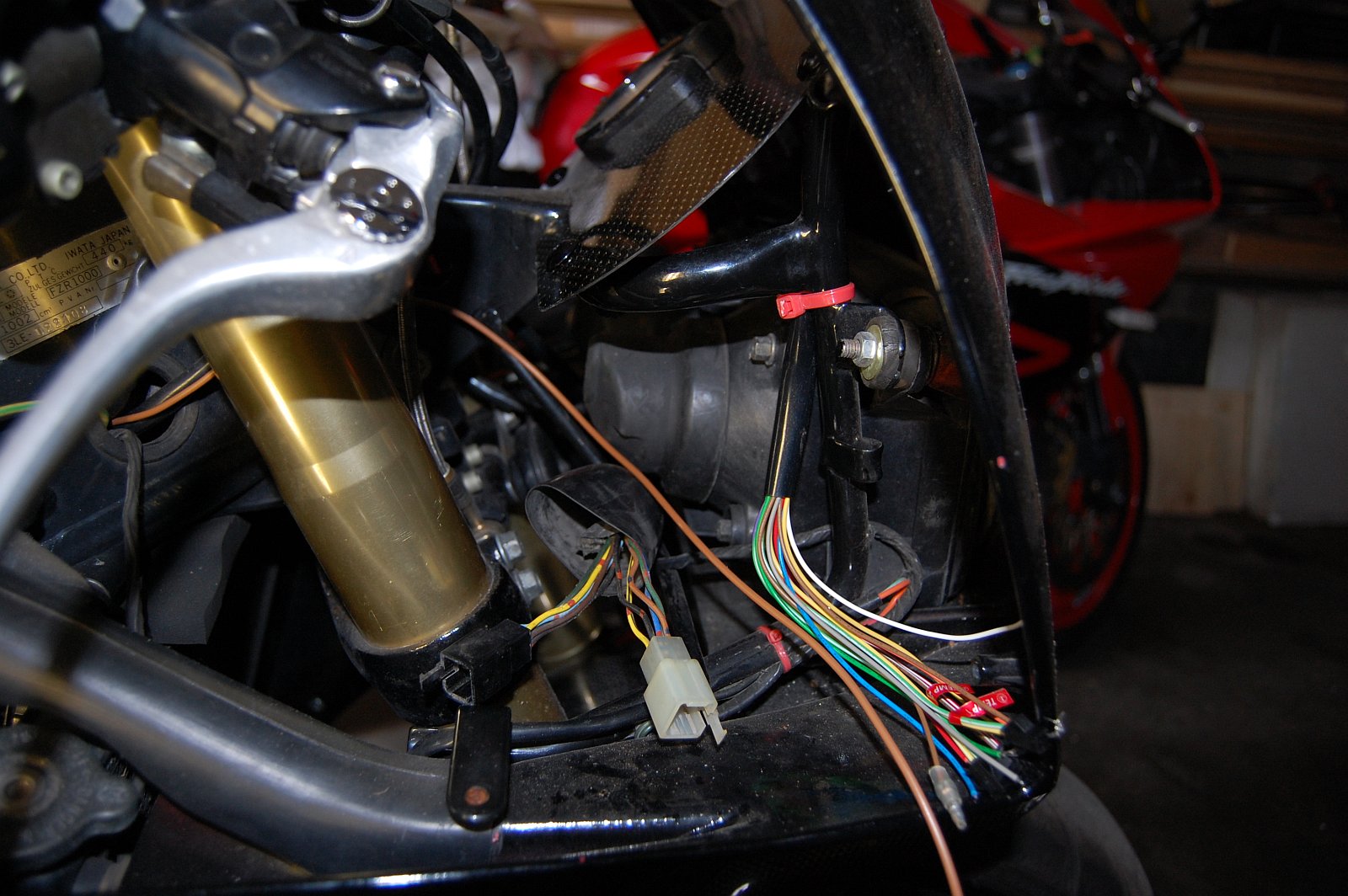 Die Öltemperatur nimmt man an der EXUP sinnigerweise an der Ölablassschraube ab mit dem Koso-Adapter M14x1,5. Das Anschlusskabel hierfür muss an beliebiger Stelle aufgetrennt und verlängert werden, es ist viel zu kurz. Diese Leitung ist 2adrig. Die Verlegung erfolgt am einfachsten an vorhandenen Kabeln entlang mit kleinen Kabelbindern oder so. Ein Kabel kommt dann an Sensor 1 und eines an Sensor 2. Ich weiß nicht mehr genau welches Wasser und welches Öl war. Bitte einfach mal probieren, die Anzeige für Wasser- und Öltemperatur stimmt sonst nicht.