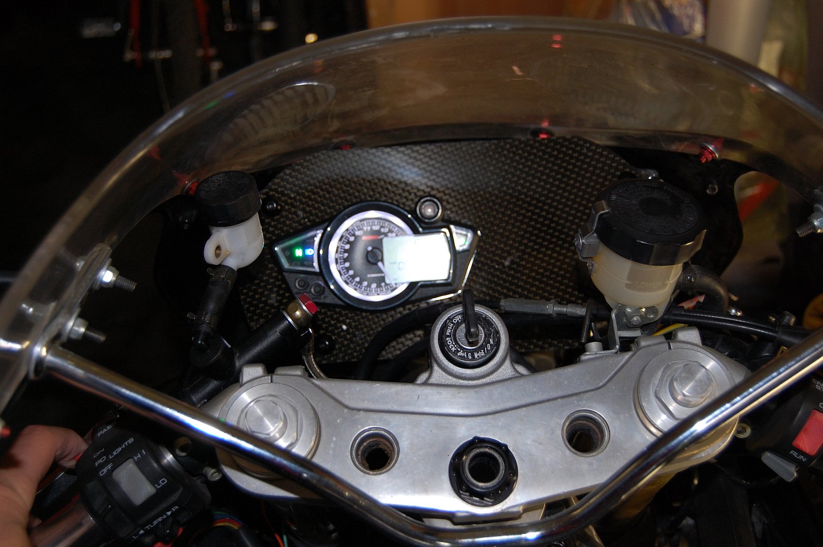 Als letztes fehlt noch der Geschwindigkeitsgeber für den Koso. Hier sind die Gegebenheiten doch bei jeder Kiste etwas unterschiedlich. Am einfachsten ist es wirklich, einen der Magnete in eine Bremsscheibenschraube zu setzen und den Halter unter einer Bremssattelschraube anzubringen und auszurichten. Ein Magnet reicht definitiv! Das Magnet hält durchaus bombenfest in einer Eisenschraube, bei Titan (wie bei mir) leider überhaupt nicht. Bei mir ging das dank Brembozangen und -scheiben und Titanbefestigungen überall nur so zu lösen, dass ich in den Brembo-Innenkranz (Alu) ein 6,0 mm Loch gebohrt habe und ein Magnet dort eingepresst wurde. Das sitzt jetzt auch fest für die Ewigkeit. Das Magnet lässt sich wirklich mit ein paar Schlägen haargenau in ein 6er Loch treiben.